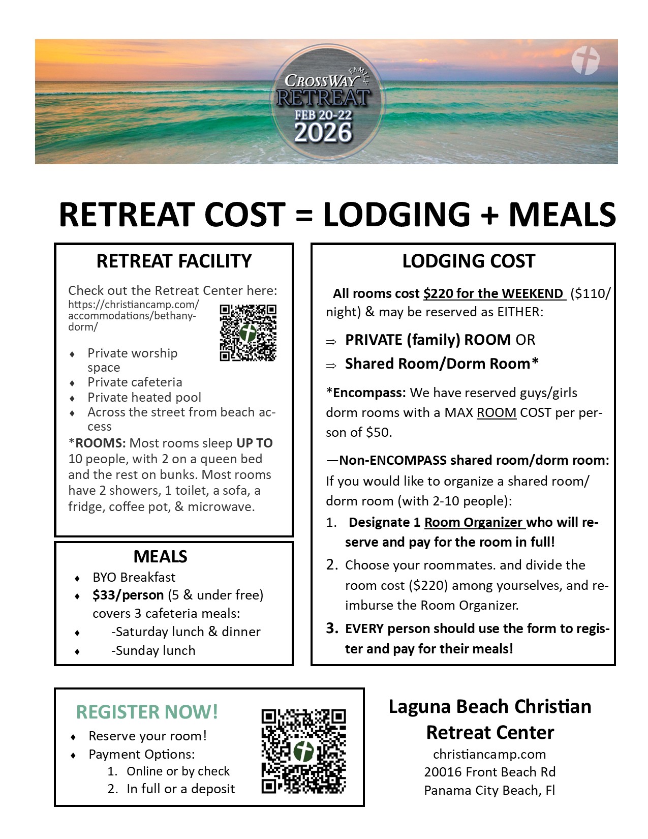 1. PAY IN FULL: Room cost + meal cost ($33/person) for all people in the room